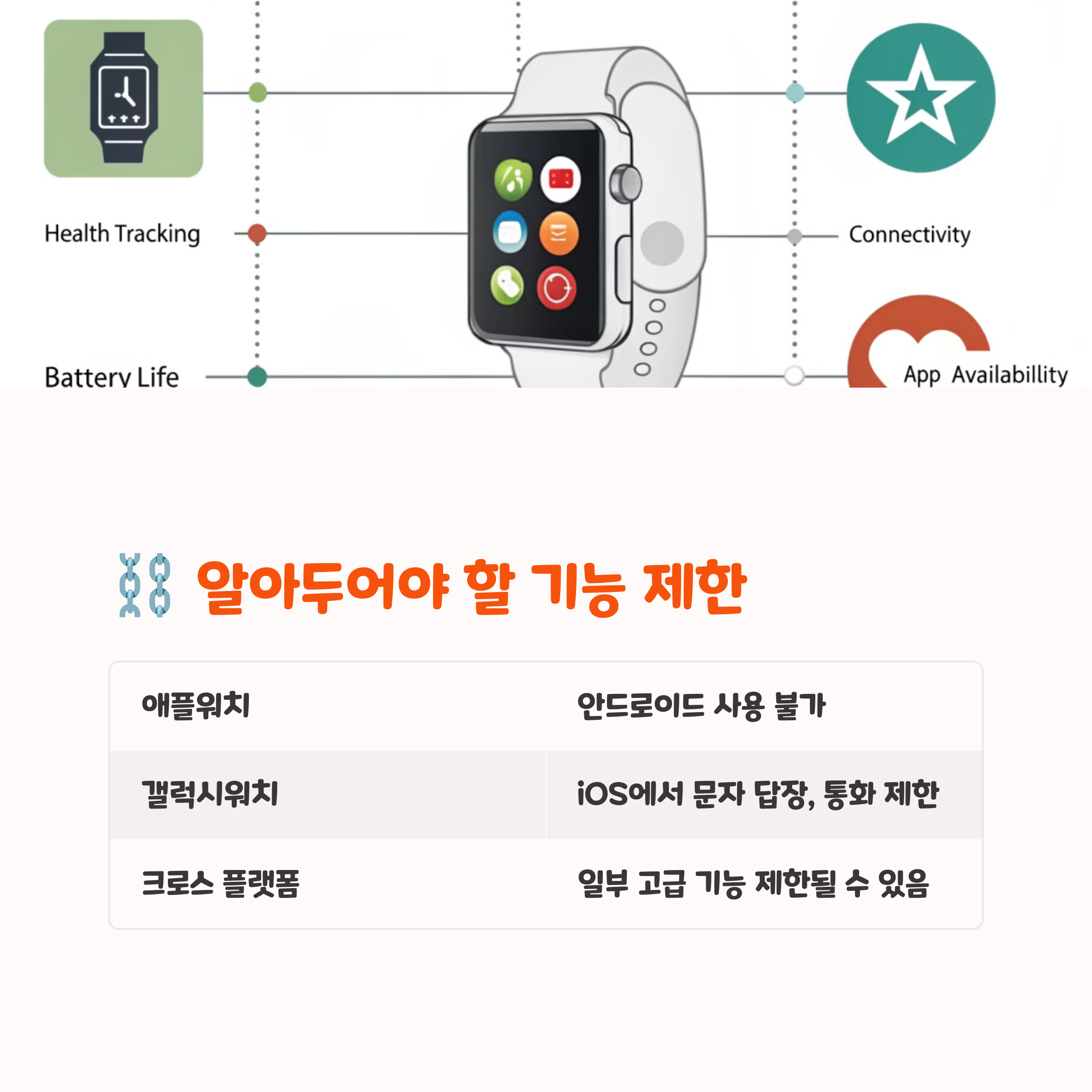 스마트워치를 구매할 때는 연결만 되는지보다 내가 원하는 기능이 해당 조합에서 잘 작동하는지를 체크하는 게 핵심이에요. 특히 건강 기능은 지원 여부가 명확하니 스펙을 꼭 확인해보는 걸 추천해요! 🔍